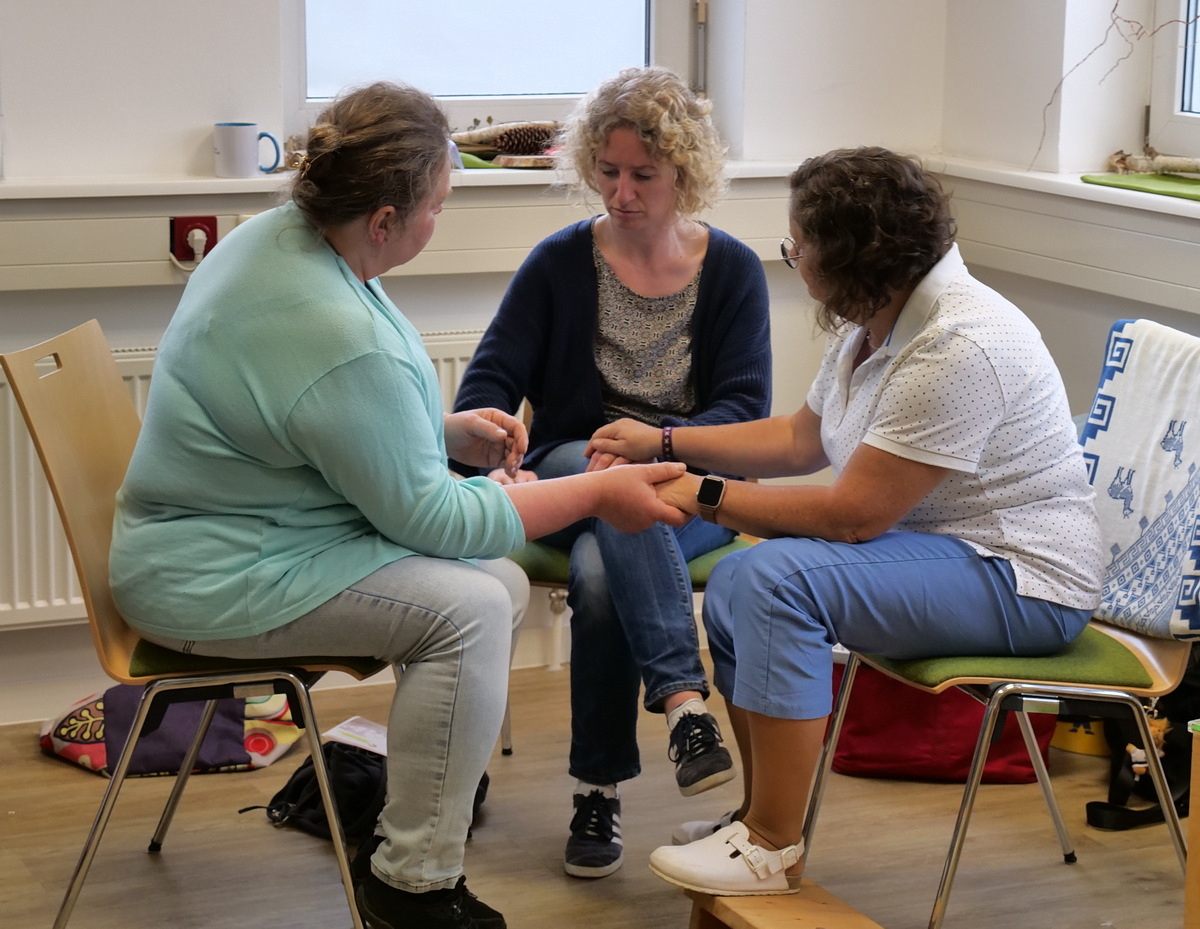 Doch auch die Kommunikation mit Menschen am Lebensende will gelernt sein, denn sie – und ihre Angehörigen – befinden sich in einer absoluten Ausnahmesituation. Die Teilnehmer erlernten die Grundlagen der Kommunikation und übten sich in Rollenspielen mit herausfordernden Gesprächssituationen. Dazu gehörte zum Beispiel der Unterschied von „Mitleiden“ und „Mitfühlen“, oder und an sich selbst auszuprobieren, wie „nah“ man einem fremden Menschen körperlich kommen darf und wo dessen Grenzen sind. Hilfreich auch zu wissen, wie man jemanden respektvoll berührt kann, ohne ihm zu nahe zu treten.